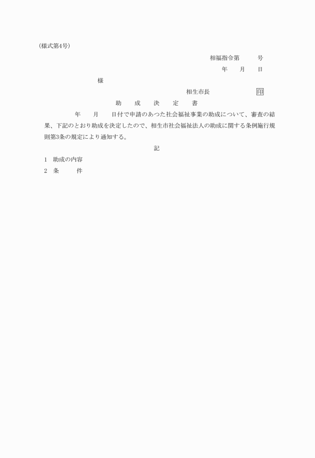 第4条 助成の決定を受けた社会福祉法人は、事業が完了したときは、事業実施状況報告書、事業実績報告書及び収支決算書を市長の定める時期までに市長に提出しなければならない。